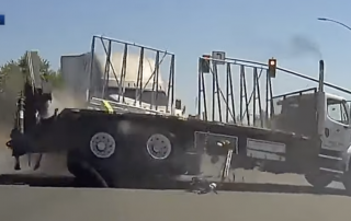 A semi truck smacks into the side of a work truck at an intersection in California in this dash cam ...more