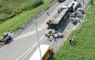 Flipped tractor trailer strikes school bus